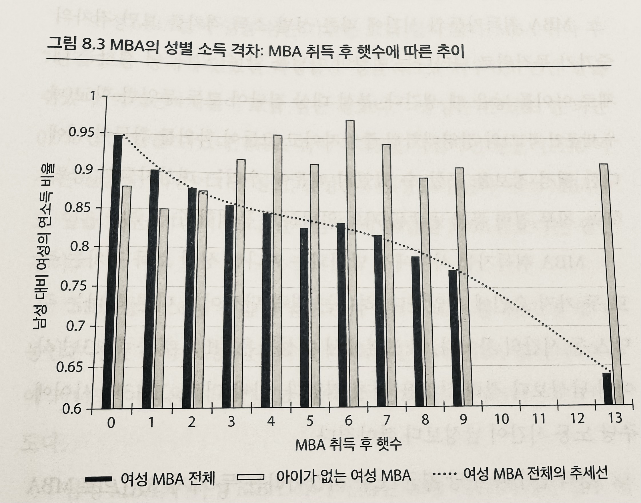남녀 임금 격차는 노동시간의 차이에서 기인 한다는 것이 나는 꽤나 놀라웠다. 왜냐면 반대로 이야기 하면 노동 시간이 같으면 임금 차이가 없다는 이야기이기 때문이다. 내가 가지고 있는 생각으로는 직장내의 성 차별적 인식으로 인한 불평등한 인사라던지 취업 과정에서 발생하는 성차별적 상황들에서 기인 하지 않을까 생각 했었다. 이 책에 의하면 그렇지 않고 육아로 인해서 여성이 일에 쓸 수 있는 시간이 부족한 것이 주요 원인이다. 책에는 수 많은 그래프가 나오지만 단 하나의 그래프만 봐야 한다면 아래 그래프를 봐야 한다고 생각한다. 아래 그래프는 MBA를 졸업한 여성들의 남성 대비 소득 비율이다. 그래프를 보면 여성 전체 MBA 졸업생들은 13년이 지나면 65%아래로 떨어진다. 흥미로운 것은 아이가 없는 여성의 경우 13년이 지나도 90%를 유지한다는 것이다. 이건 MBA의 예시이긴 하지만 책에 따르면 다른 직업군들에 대해서도 비슷한 사례를 많이 발견 할 수 있다. 즉, 남성과 여성이 같은 조건에서 같은 시간만큼 일을 한다면 약간의 차이는 있을 수 있지만 현재 보이고 있는 임금 격차의 상당수는 줄어들 수 있다.