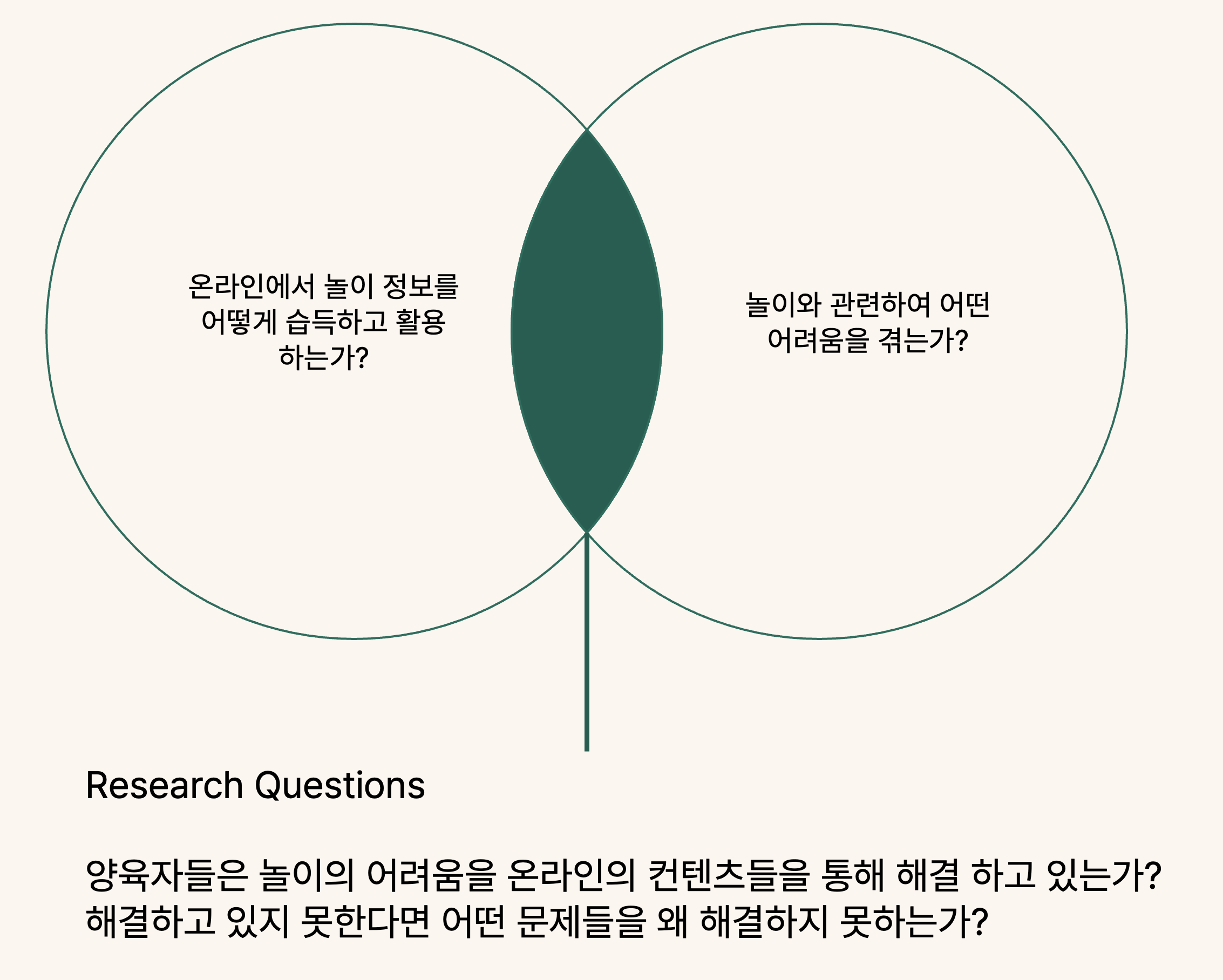위 질문에 대해서 답을 하기 위해서는 양육자를 이해해야 한다. 우리는 경험적으로 양육자들이 수많은 정보를 온라인으로 얻고 있다는 것을 알고 있었기 때문에 1) 양육자들이 놀이 정보들을 온라인으로 어떤 경로로 습득하고 어떻게 활용 하는지, 그리고 2) 그럼에도 불구하고 놀이와 관련하여 어떤 어려움들을 겪고 있는지 이해를 하면 온라인에 있는 놀이 컨텐츠들이 어떤 한계를 가지고 있는지 이해 할 수 있을 것이라 생각 했다.
