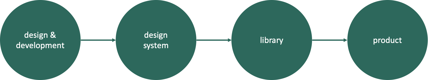 내 생각에 위의 책에서 발췌한 그림은 정확하게 라이브러리와 제품의 관계를 표현하지 못한다고 생각해서 아래와 같이 다시 그려 보았다. 내가 이해하기로는 디자인 시스템은 좀 더 범용적인 개념이기 때문에 실제 제품을 만들때는 라이브러리를 사용 하는 것이다. 아래와 같은 구조를 만든다면 디자인 시스템의 변경을 통해서 라이브러리를 변경하고 이것이 제품의 변경으로 이어지기 때문에 전체 시스템이 모두 동시에 업데이트가 된다. 그렇기 때문에 모든 구성품들이 쓸모 없어지는 것을 피할 수 있다.